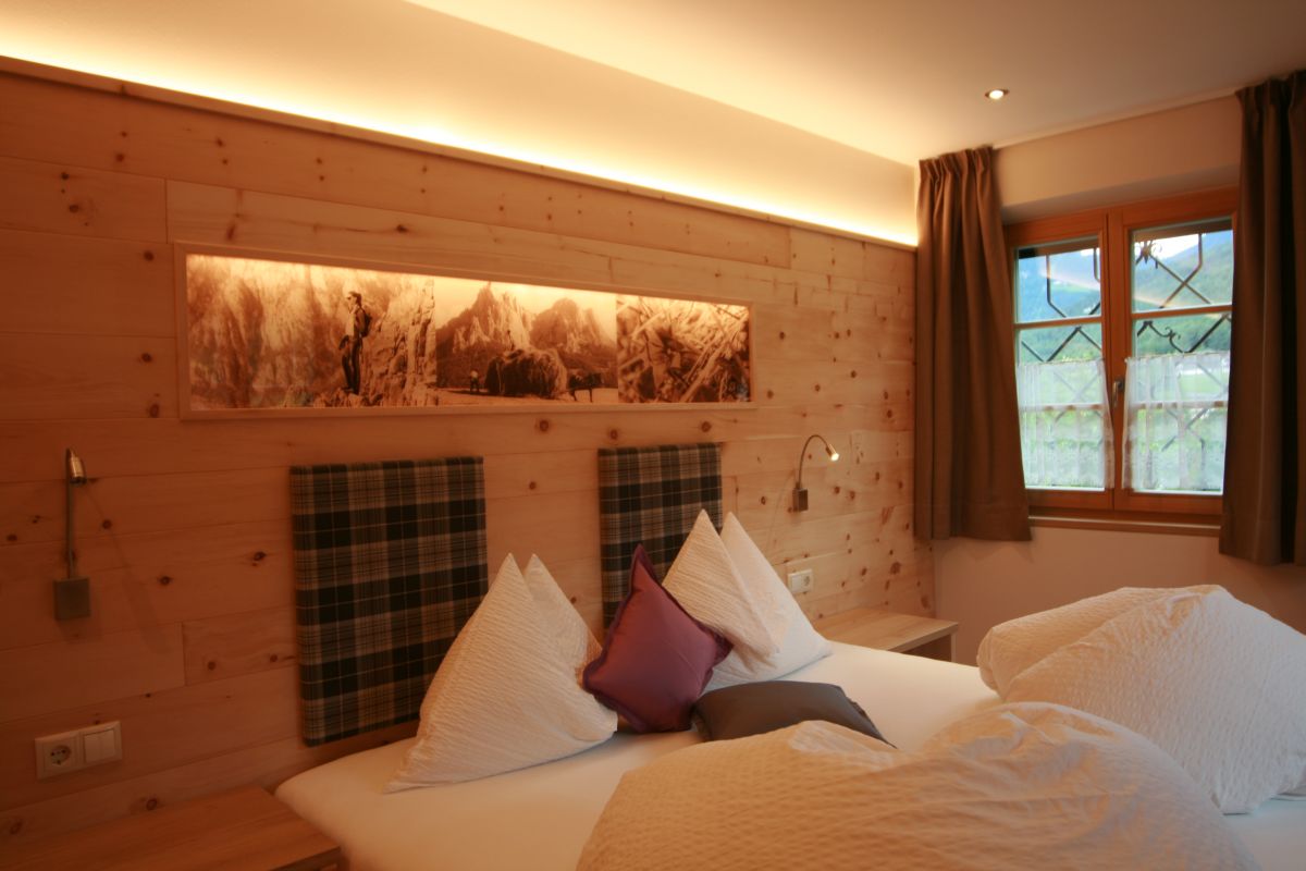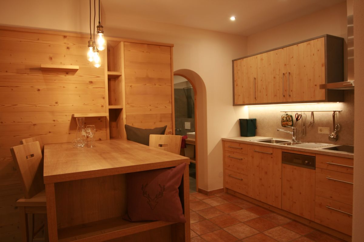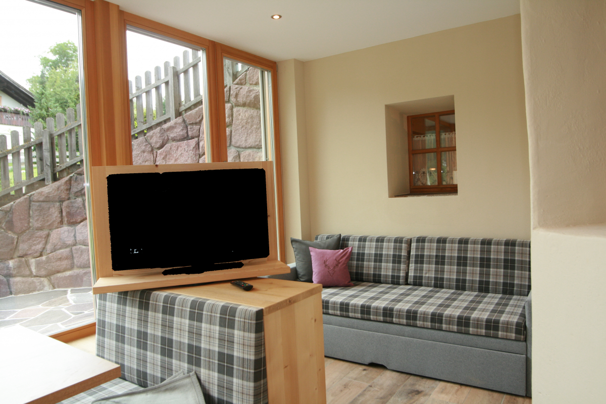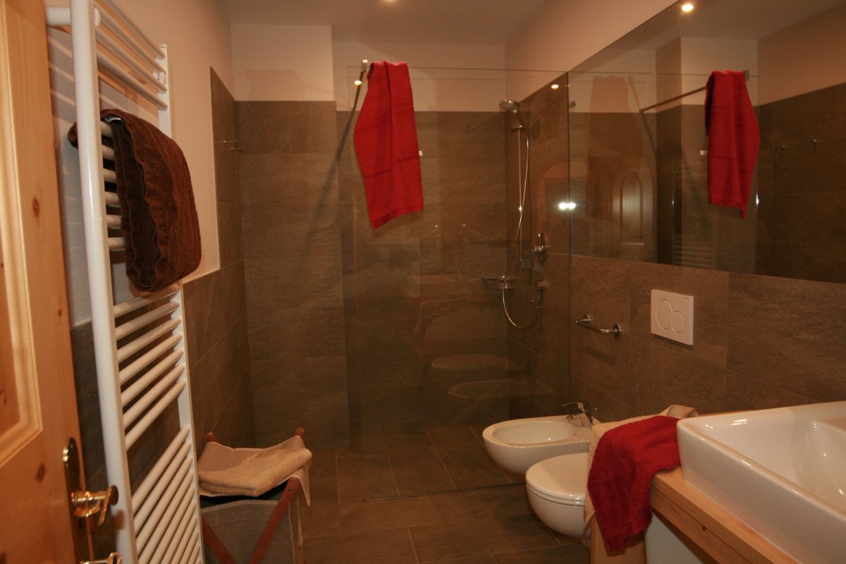 Solid spruce wood apartment with large terrace (52m²) and spectacular view at Mount Sciliar, on the ground floor to south with solid spruce wood and oak tree deal board, LCD-flat screen, large winter garden with divan and dining area. Separate kitchen with modern high poser table and dishwasher. 1 ample bathroom with hair blower, make-up mirror, bidet and WC. 1 spacious bedroom with aromatic Swiss stone pine.